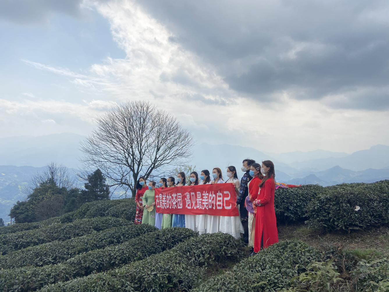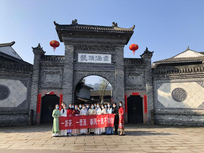 蒙頂皇茶團隊全體女士著盛裝,在接受了公司男同事代表祝福后,整隊前往蒙頂酒莊,學習酒文化、交流個性化定制業(yè)務。