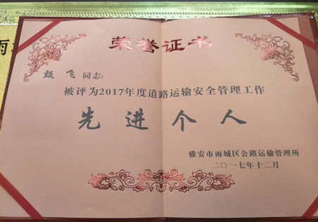 12月27日上午,雨城區(qū)運(yùn)管所組織召開“2017道路運(yùn)輸企業(yè)安全生產(chǎn)工作總結(jié)表彰大會(huì)”,我公司分管負(fù)責(zé)人甄飛代表公司參加會(huì)議,本年,我公司從內(nèi)部管理著手在安全生產(chǎn)工作中加強(qiáng)監(jiān)管力度,完善制度保障,取得成效得到了行業(yè)主管部門的認(rèn)可,本次大會(huì),我公司獲得了“雨城區(qū)2017年度道路運(yùn)輸安全管理工作”先進(jìn)單位,我公司安全經(jīng)營工作分管領(lǐng)導(dǎo)甄飛榮獲“2017年度道路運(yùn)輸安全管理工作”先進(jìn)個(gè)人。我公司一定不負(fù)榮譽(yù),2018年繼續(xù)狠抓安全生產(chǎn)工作,保障藝峰旅游轉(zhuǎn)型發(fā)展。